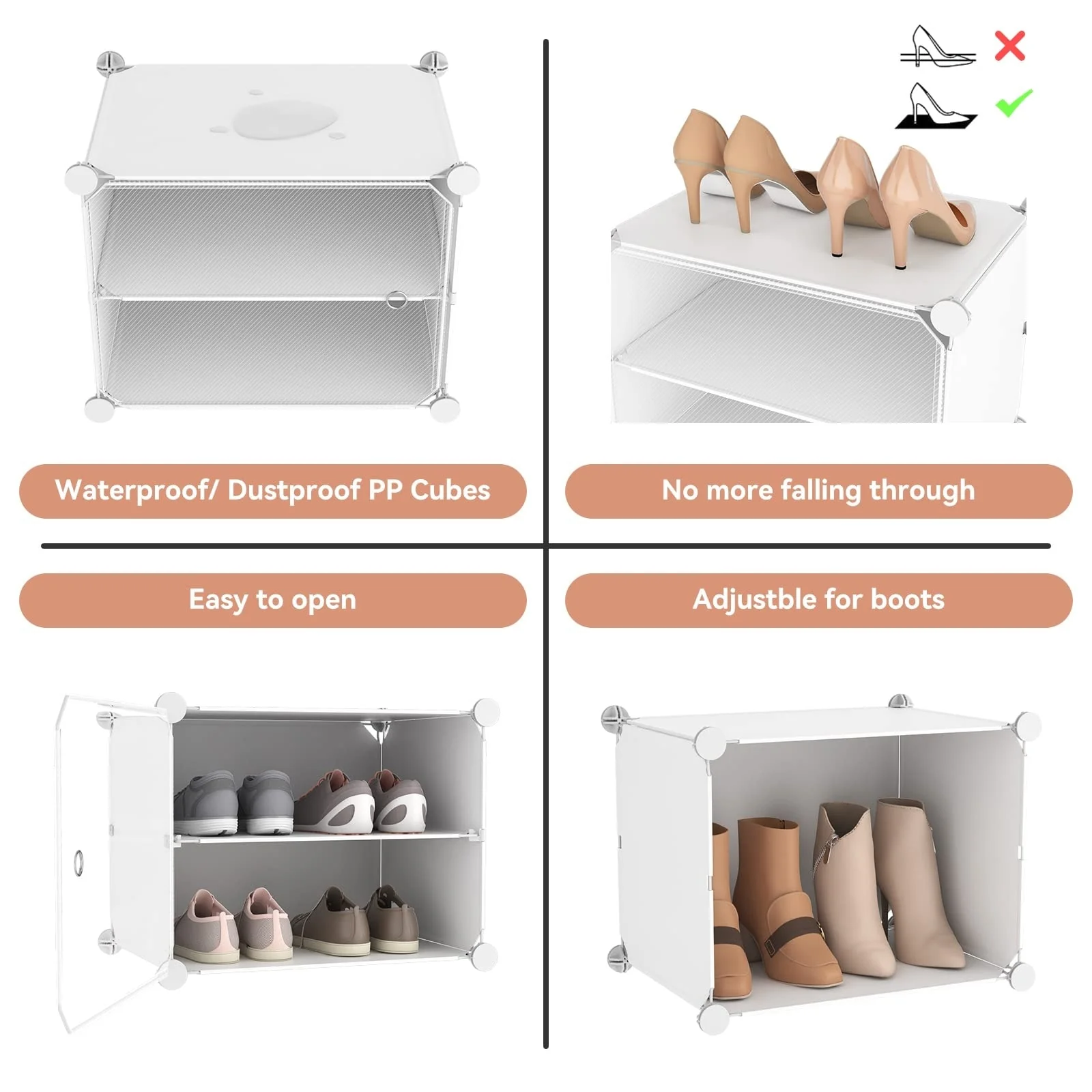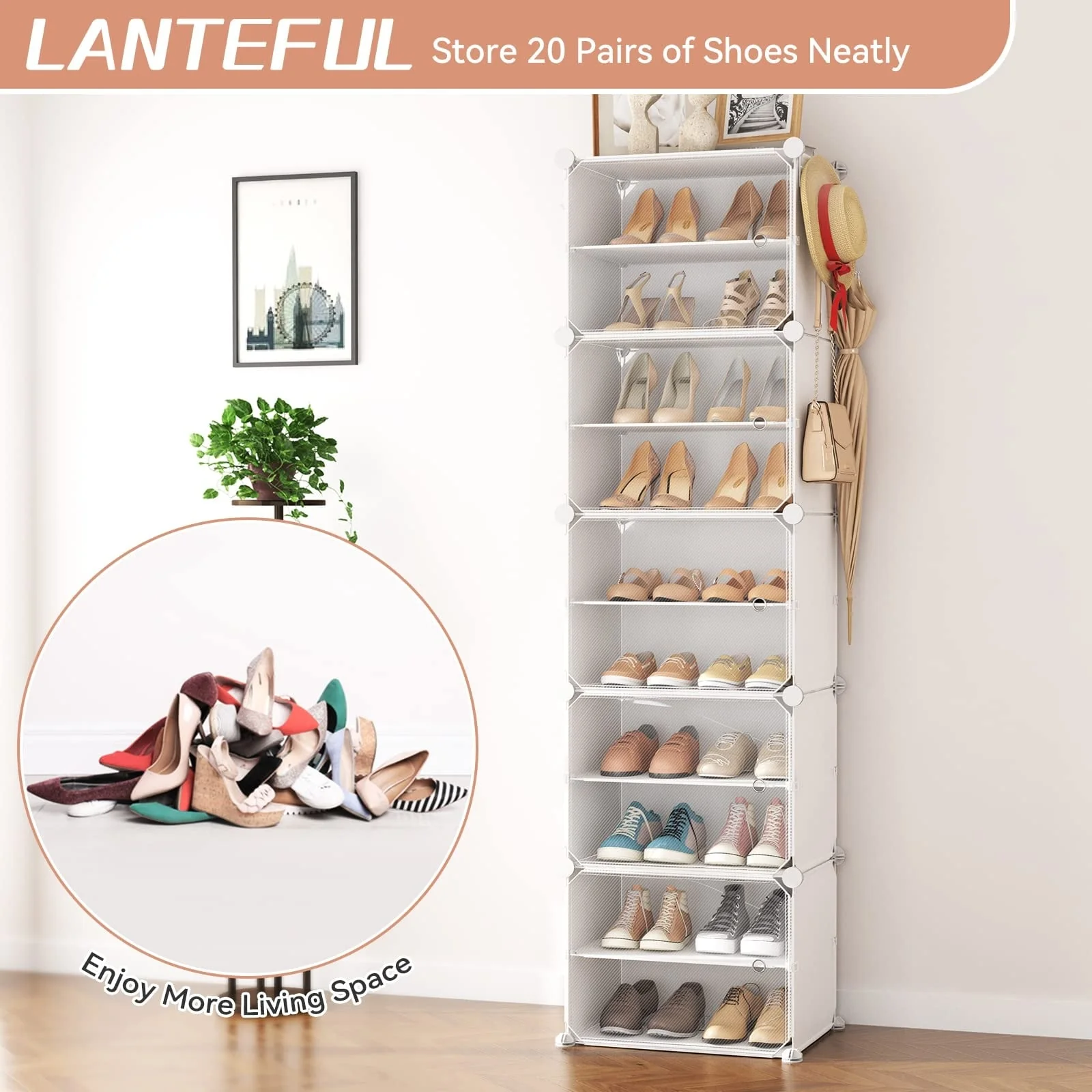 10 Tier Shoe Storage Cabinet with Door, Portable Narrow Organizer Rack for 20 Pairs, White Plastic with Hooks for Entryway
