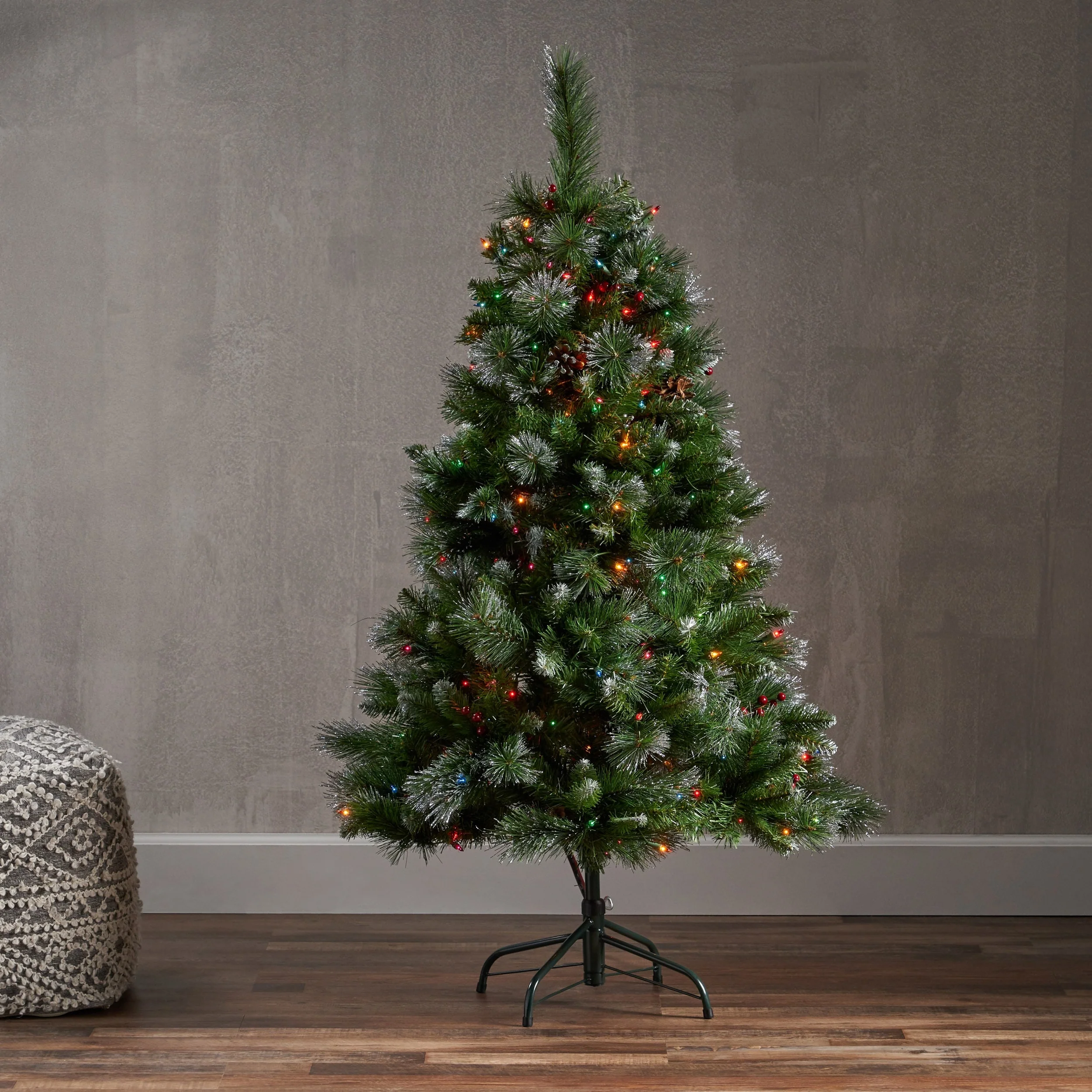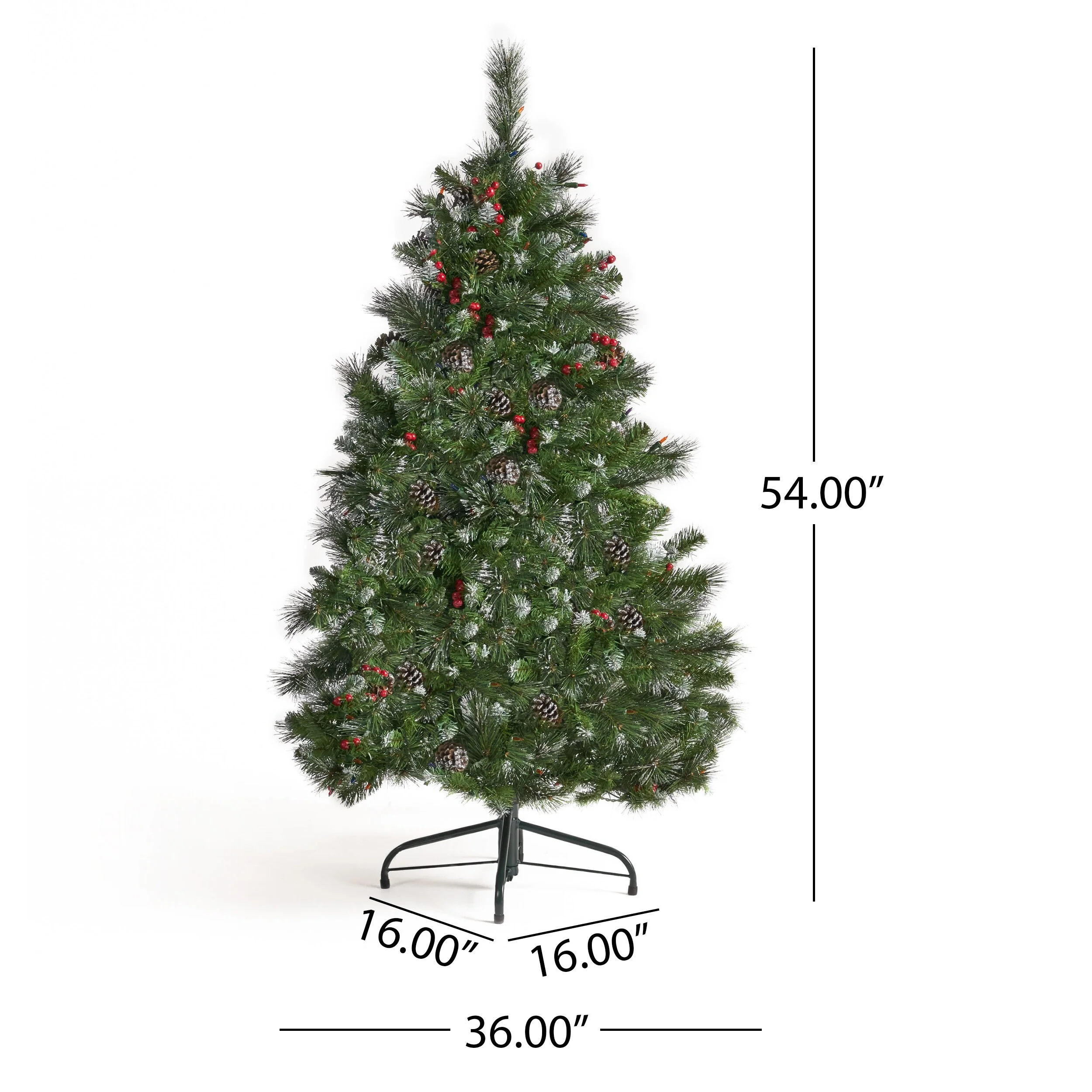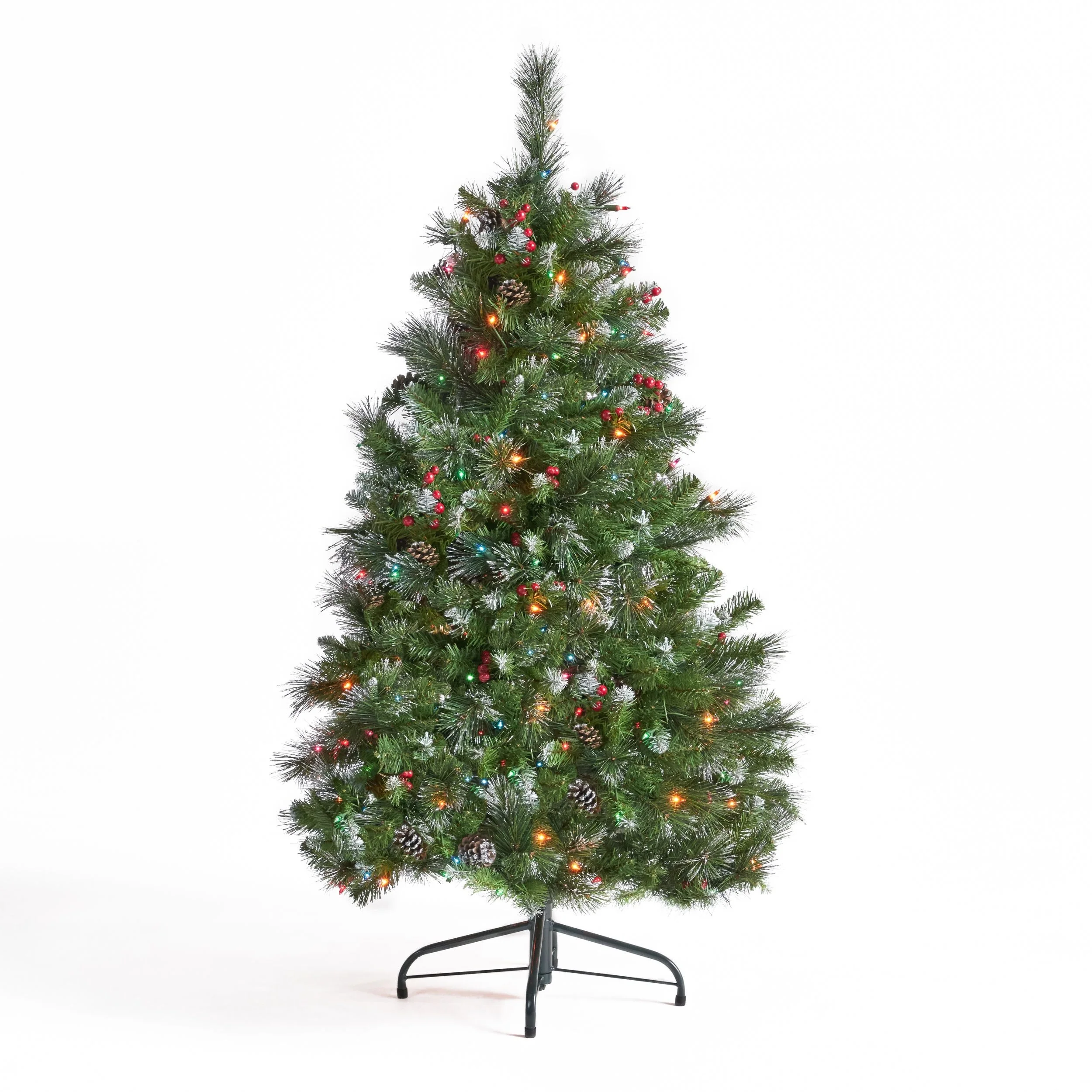 4.5ft Glittered Hinged Christmas Tree with Red Berries, Pine Cones, and Clear Lights