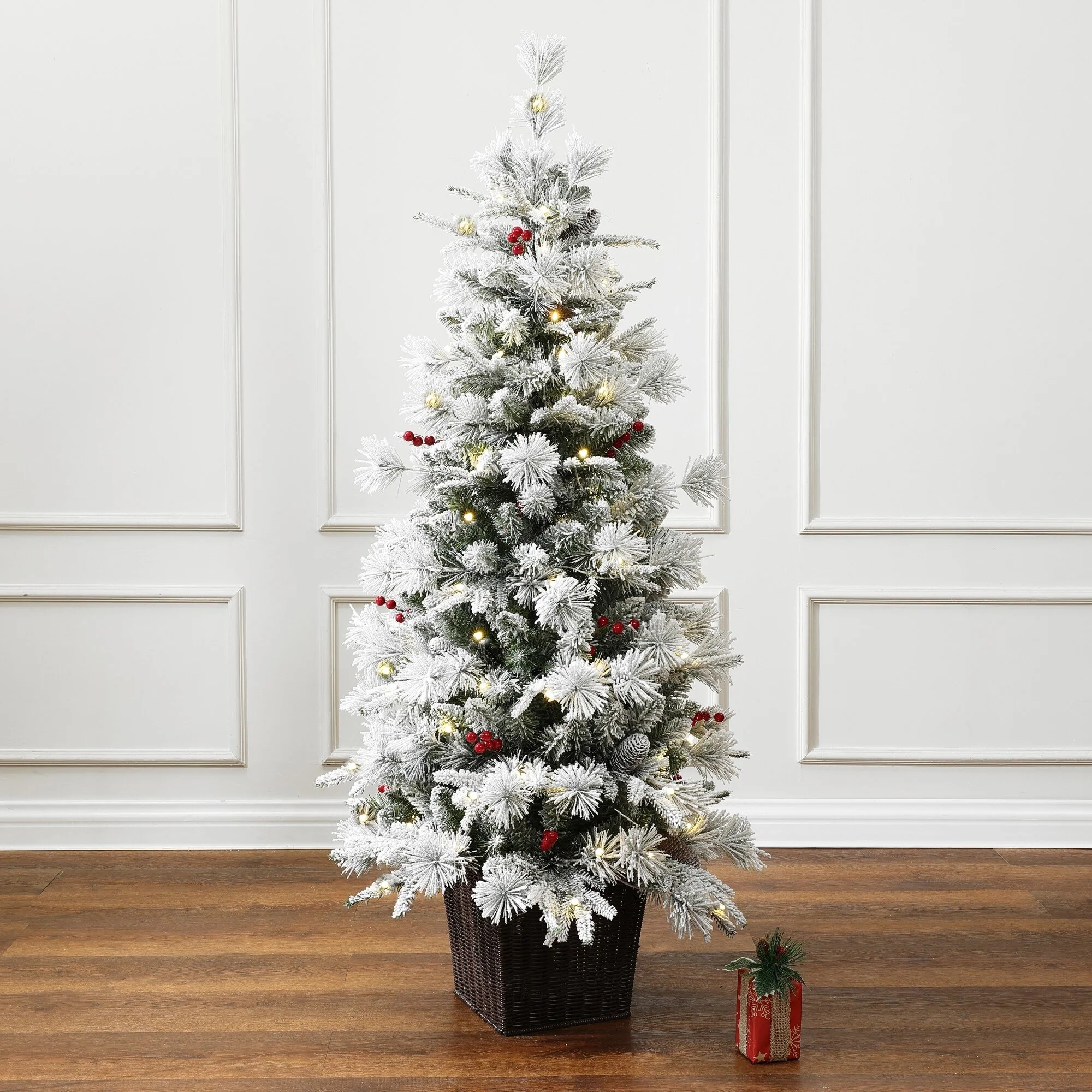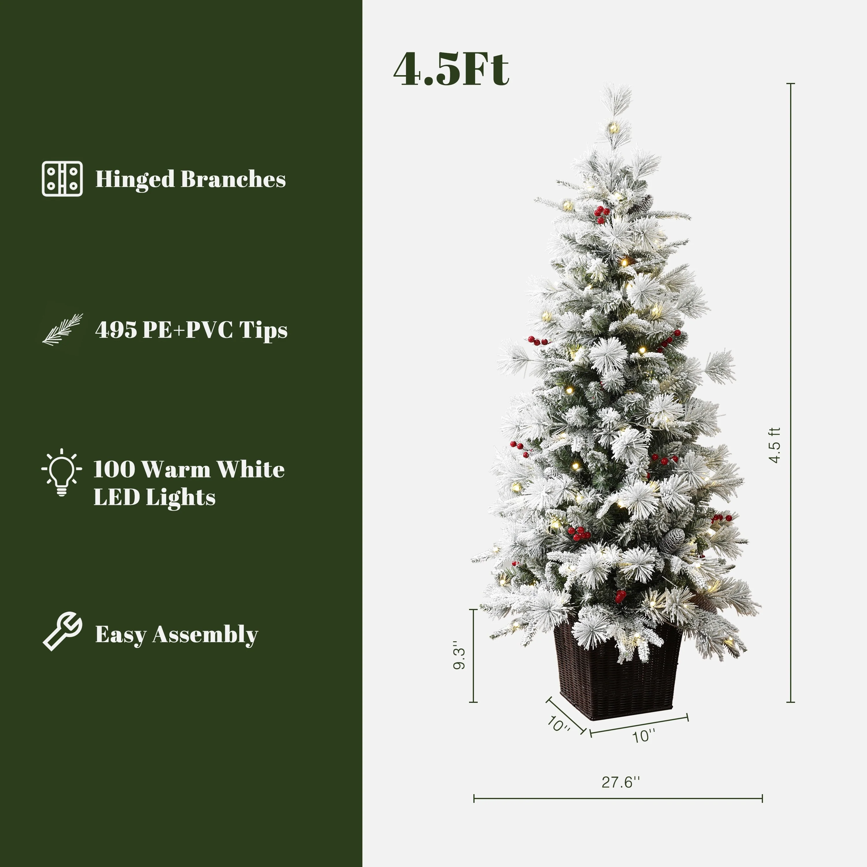 4.5Ft Pre-Lit Snow Flocked Full Pine Potted Artificial Christmas Tree - 54" H x 31.5" Diameter