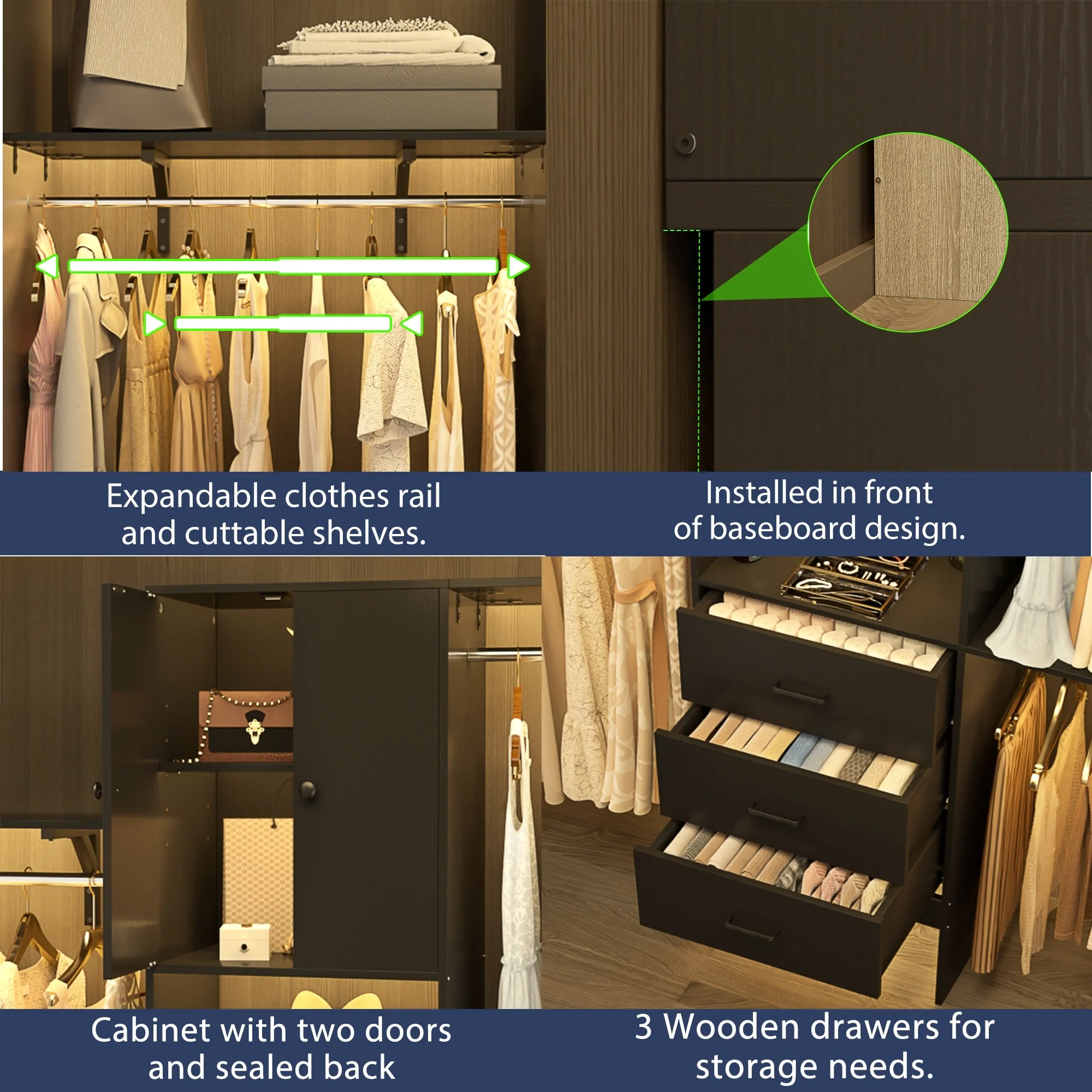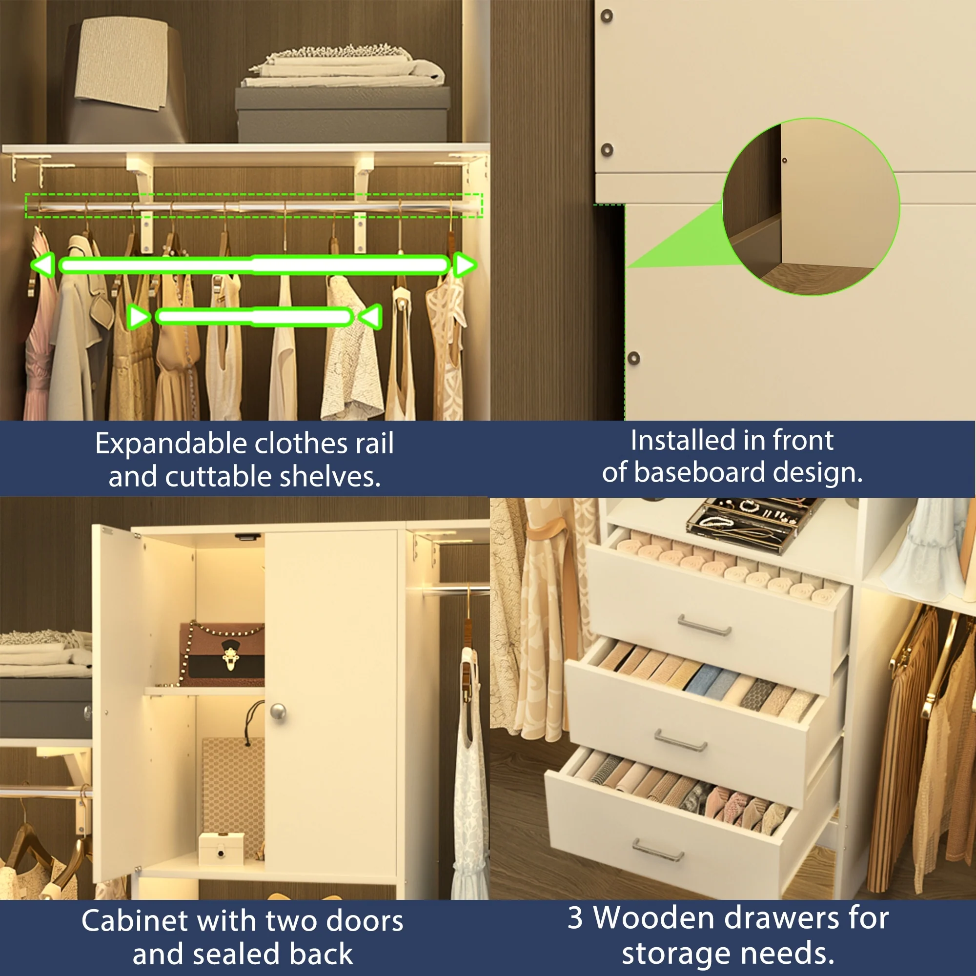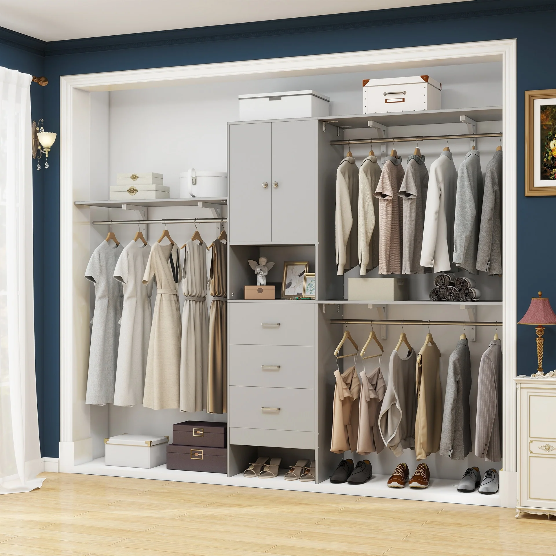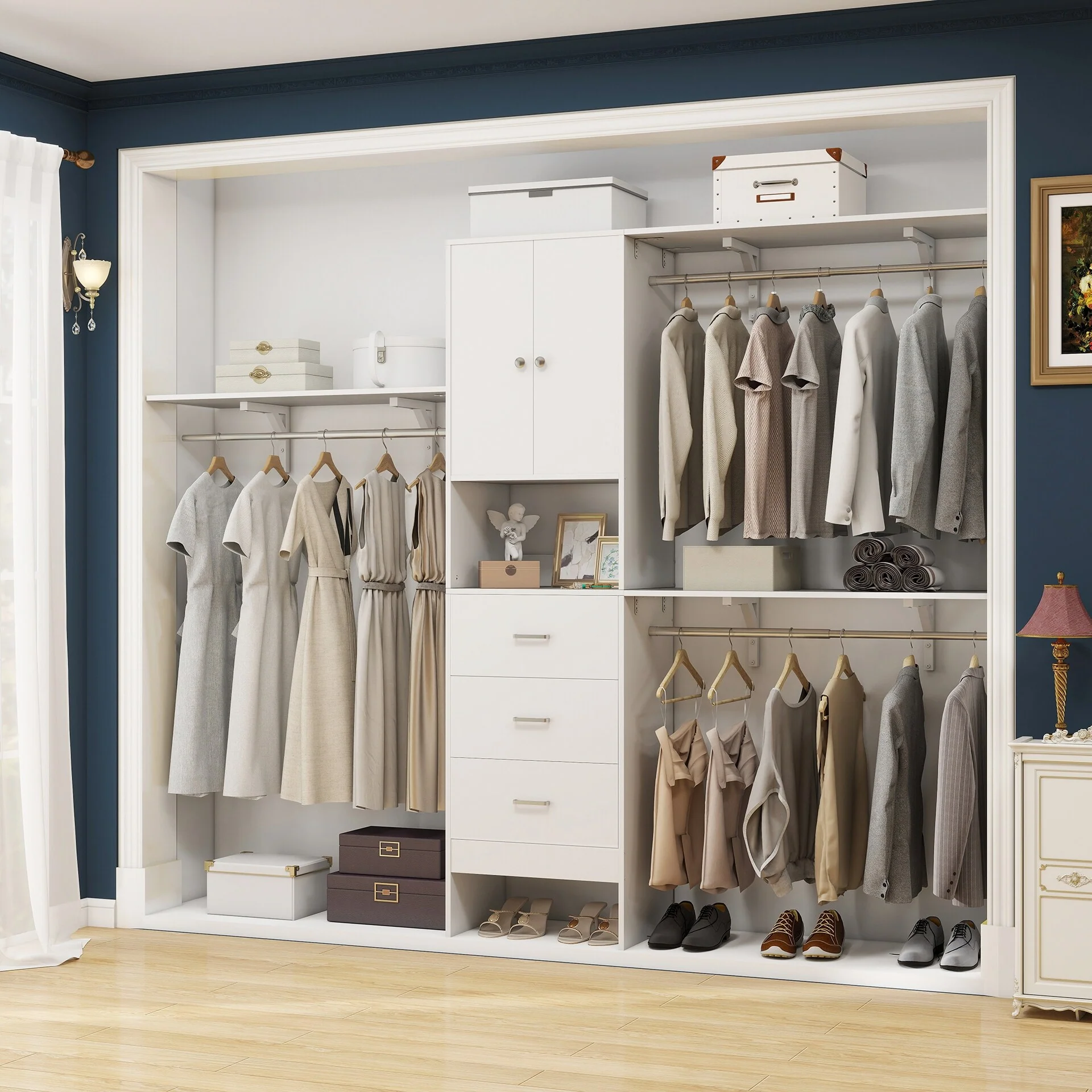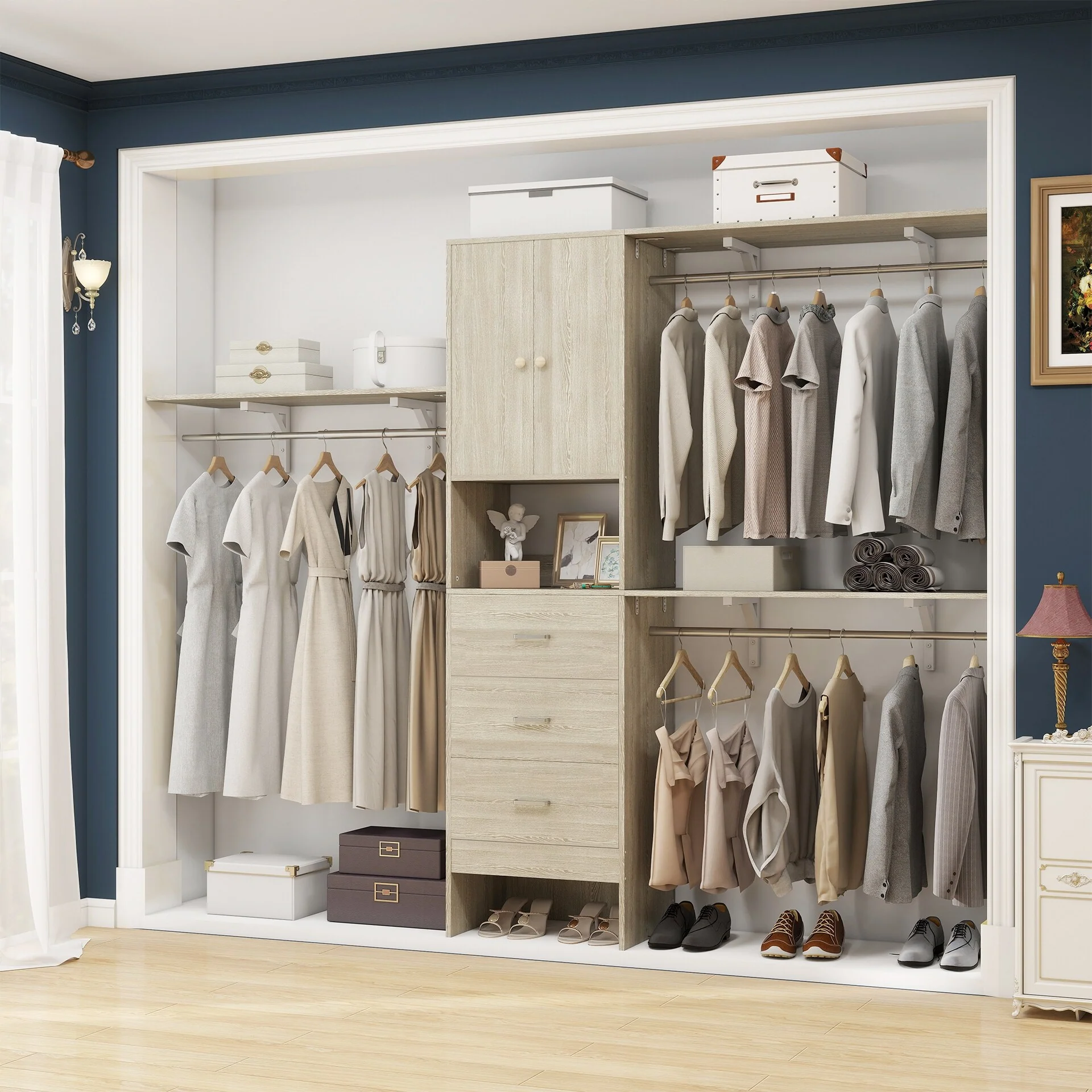 20''-96'' Wide Wooden Closet Organizer With Doors, Adjustable Closet System with Drawers and Hanging Rods
