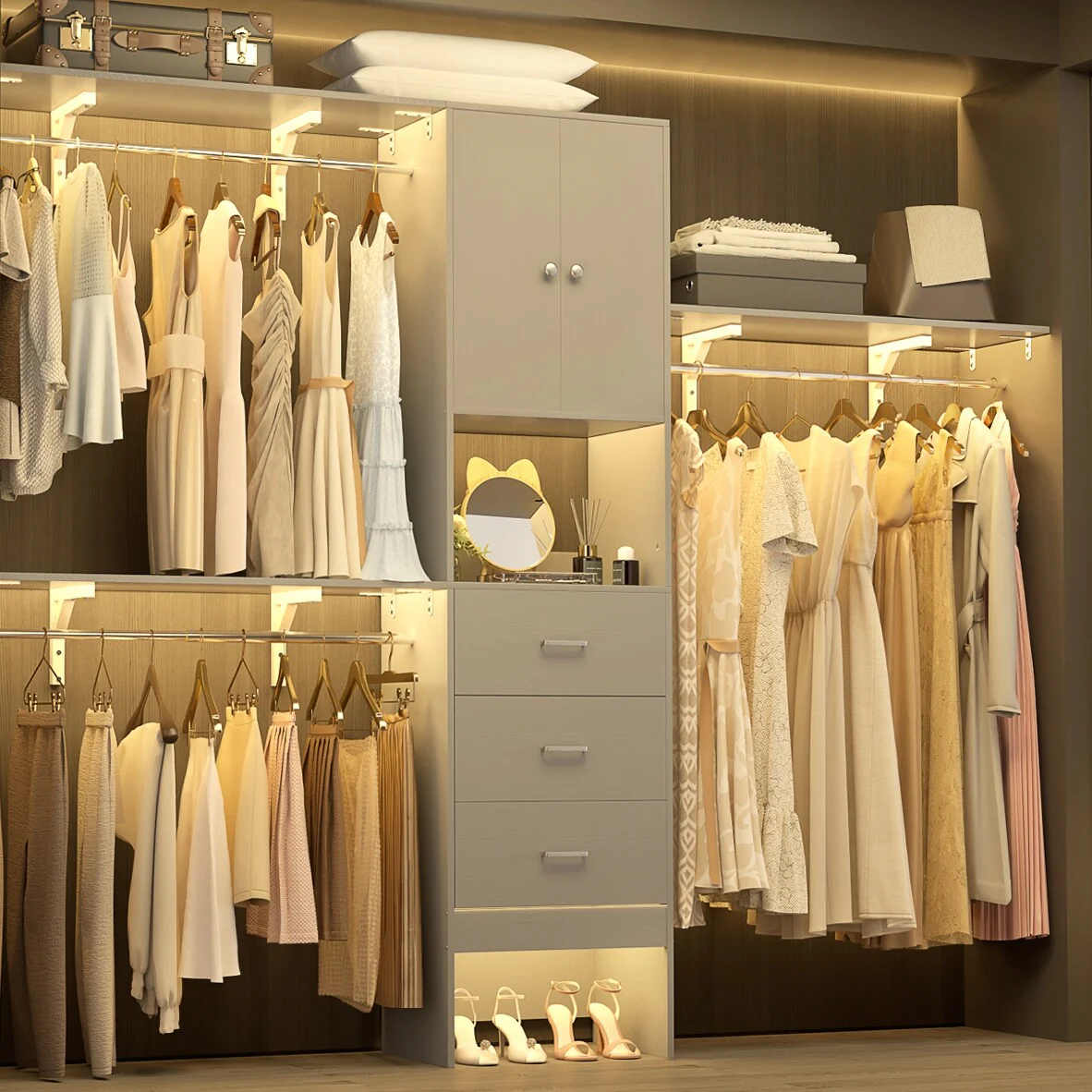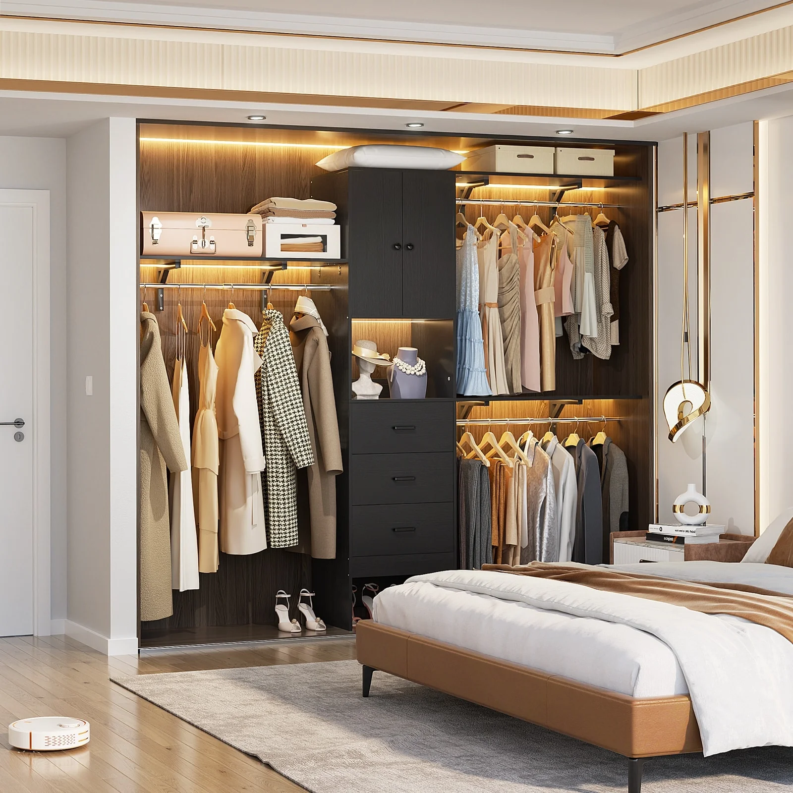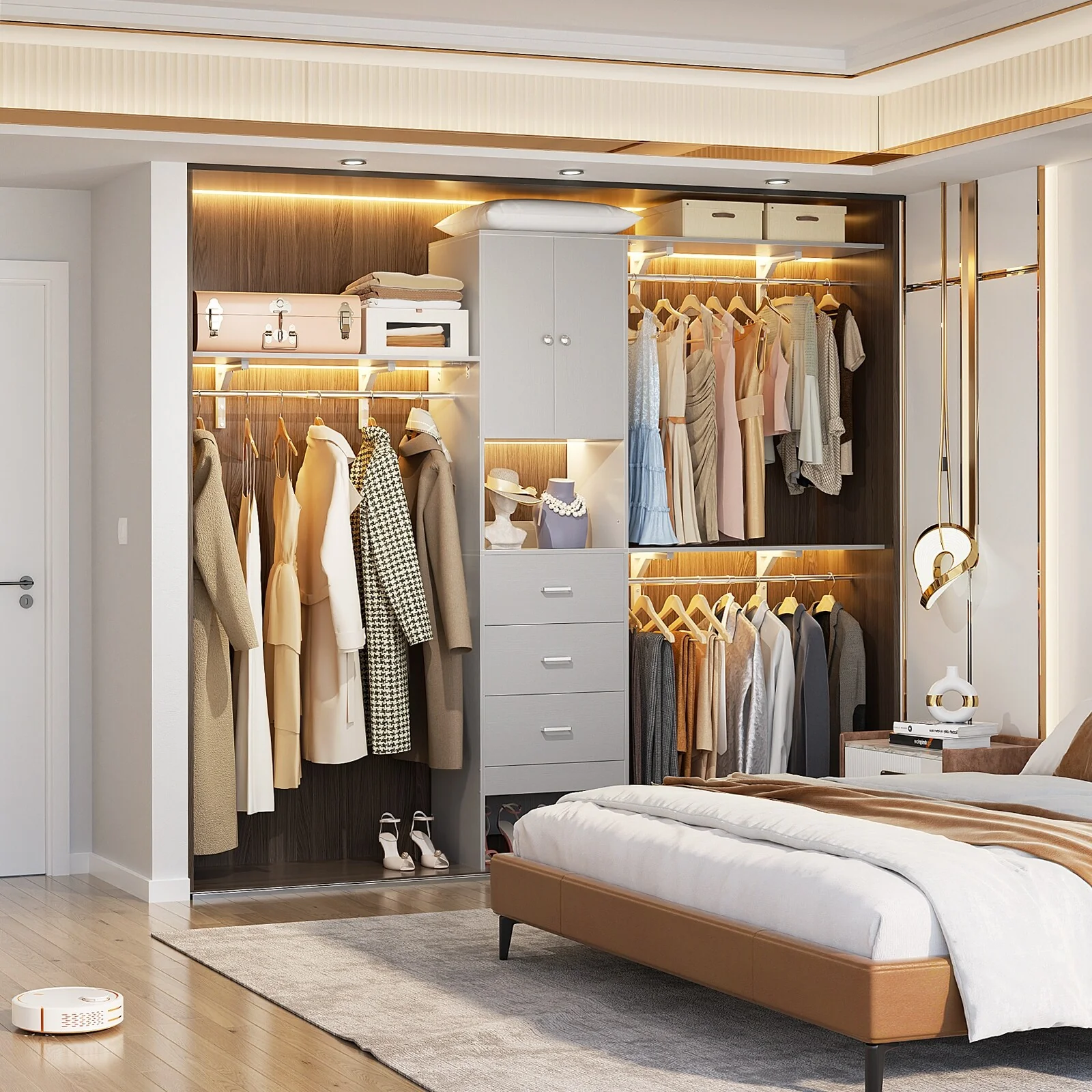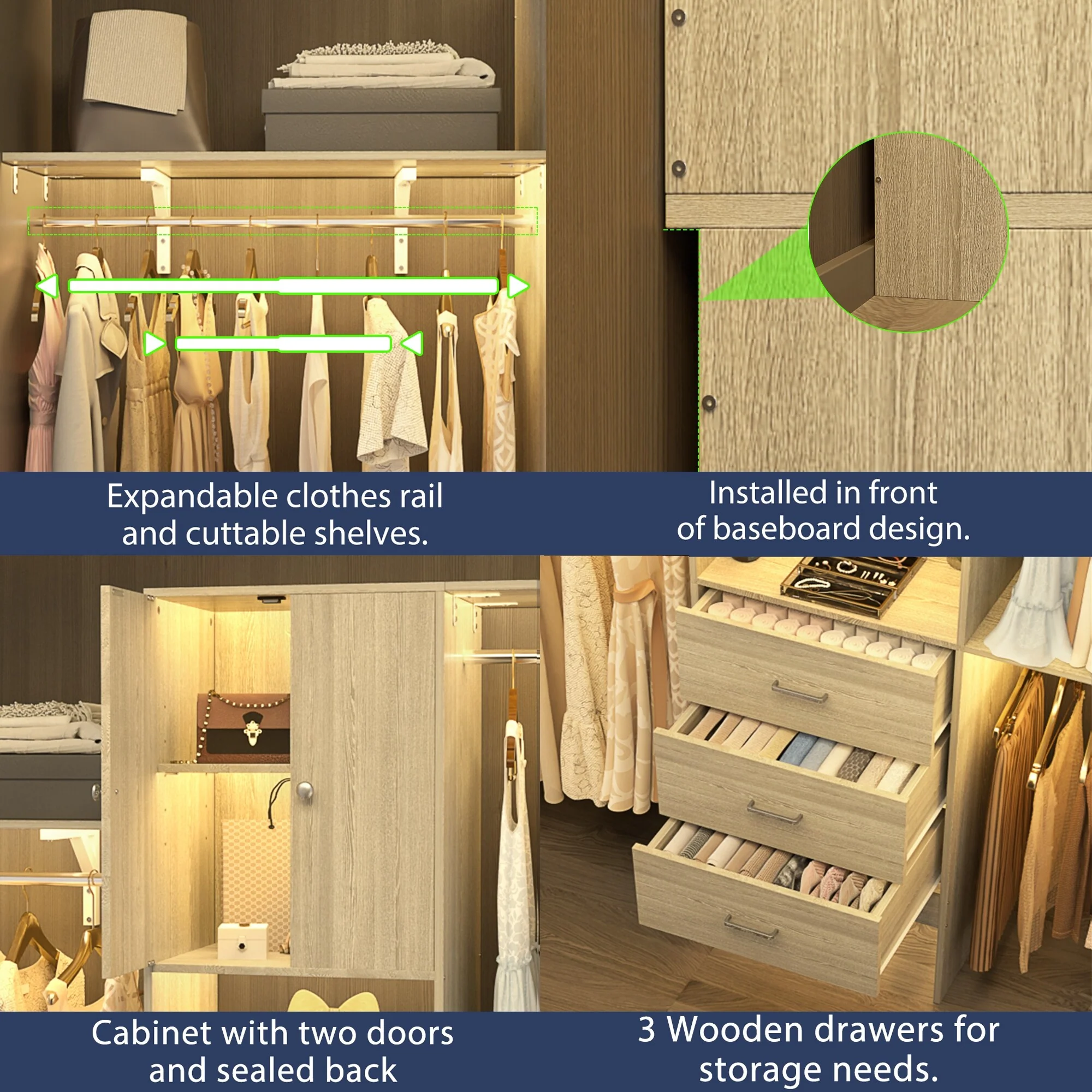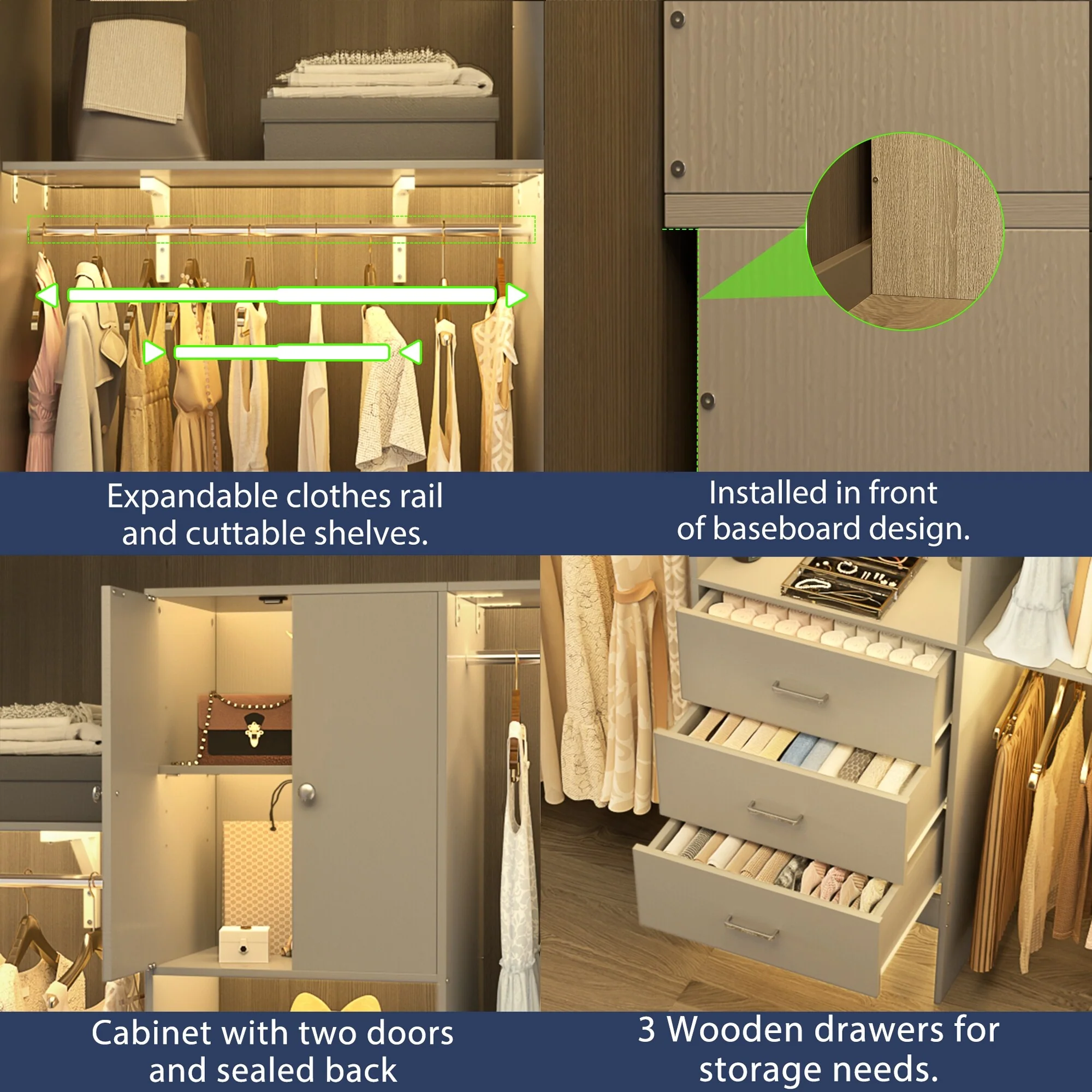 20''-96'' Wide Wooden Closet Organizer With Doors, Adjustable Closet System with Drawers and Hanging Rods