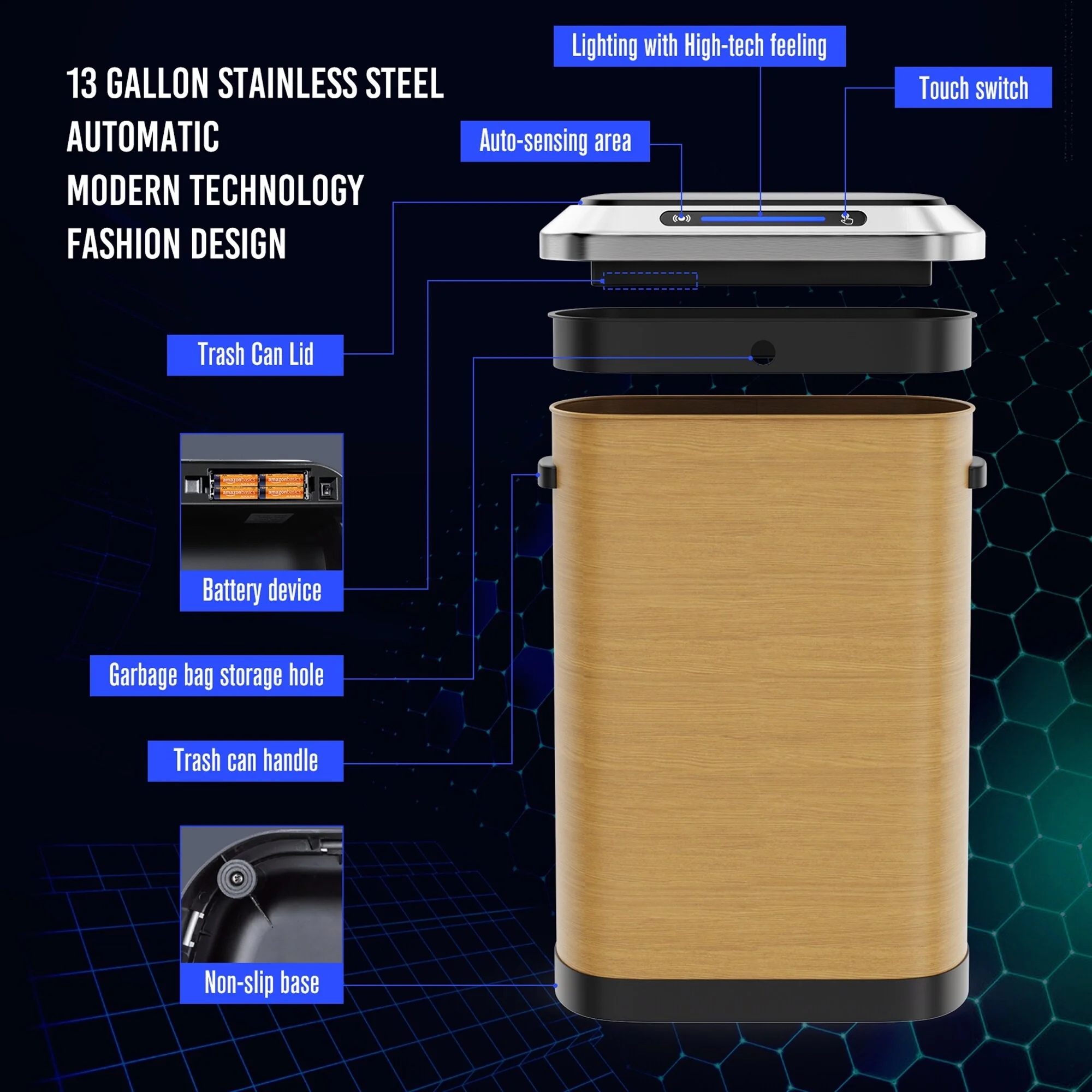 50 Liter / 13.2 Gallon Touchless Rectangular Motion Sensor Trash Can, Brushed Stainless Steel Finish