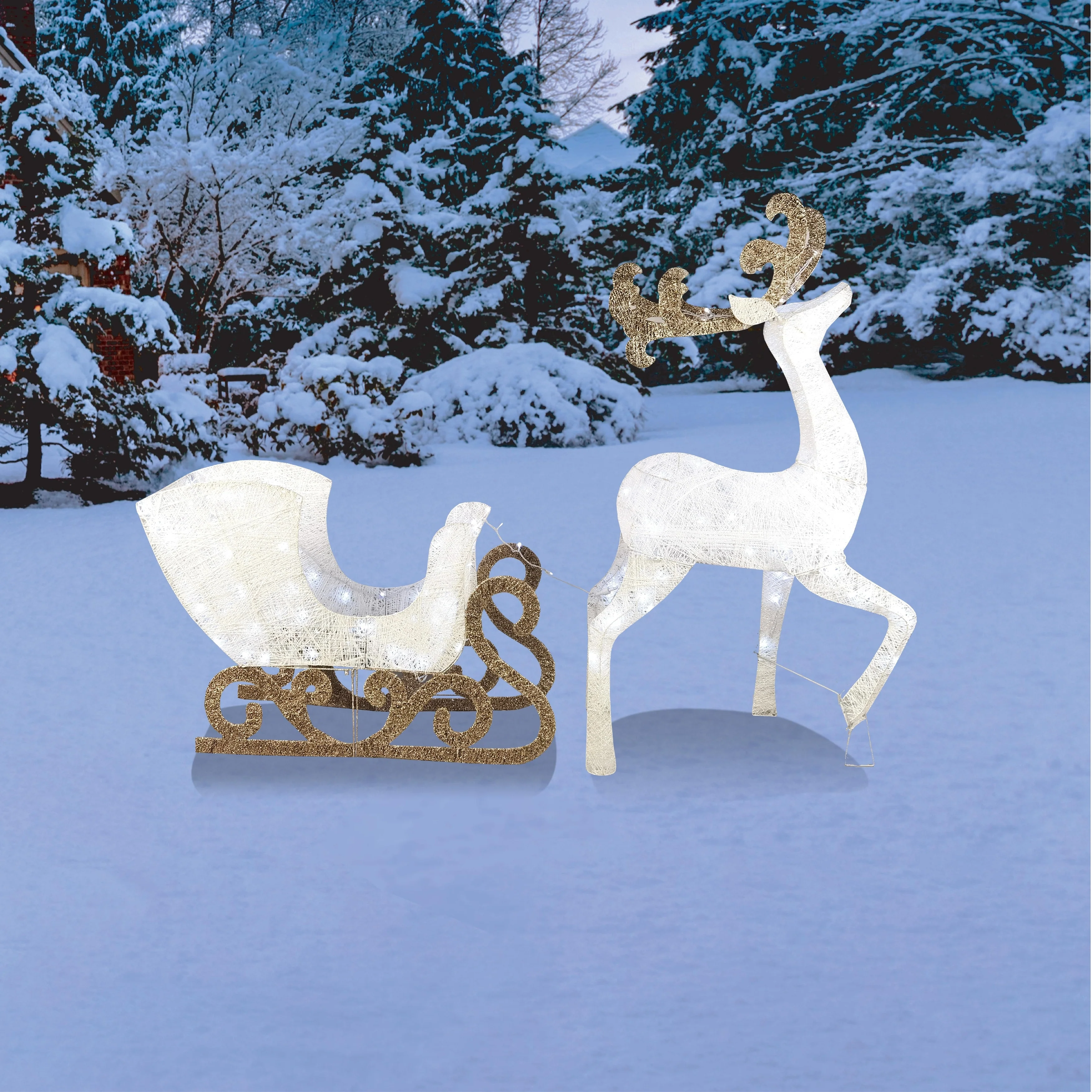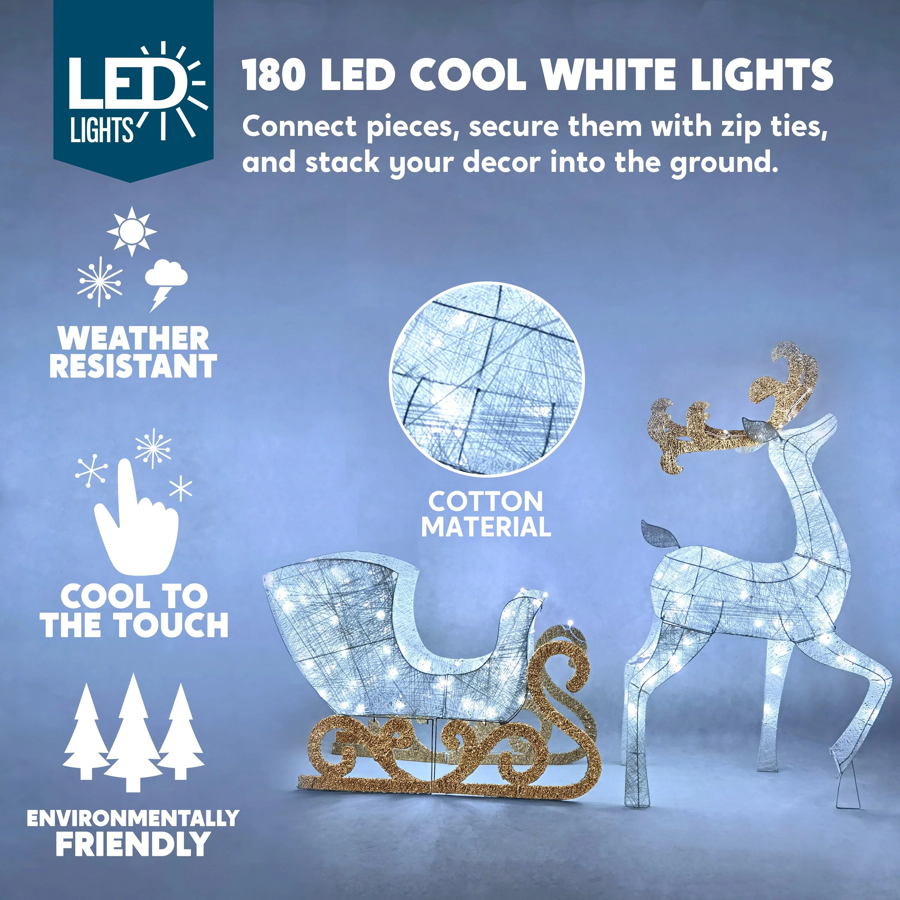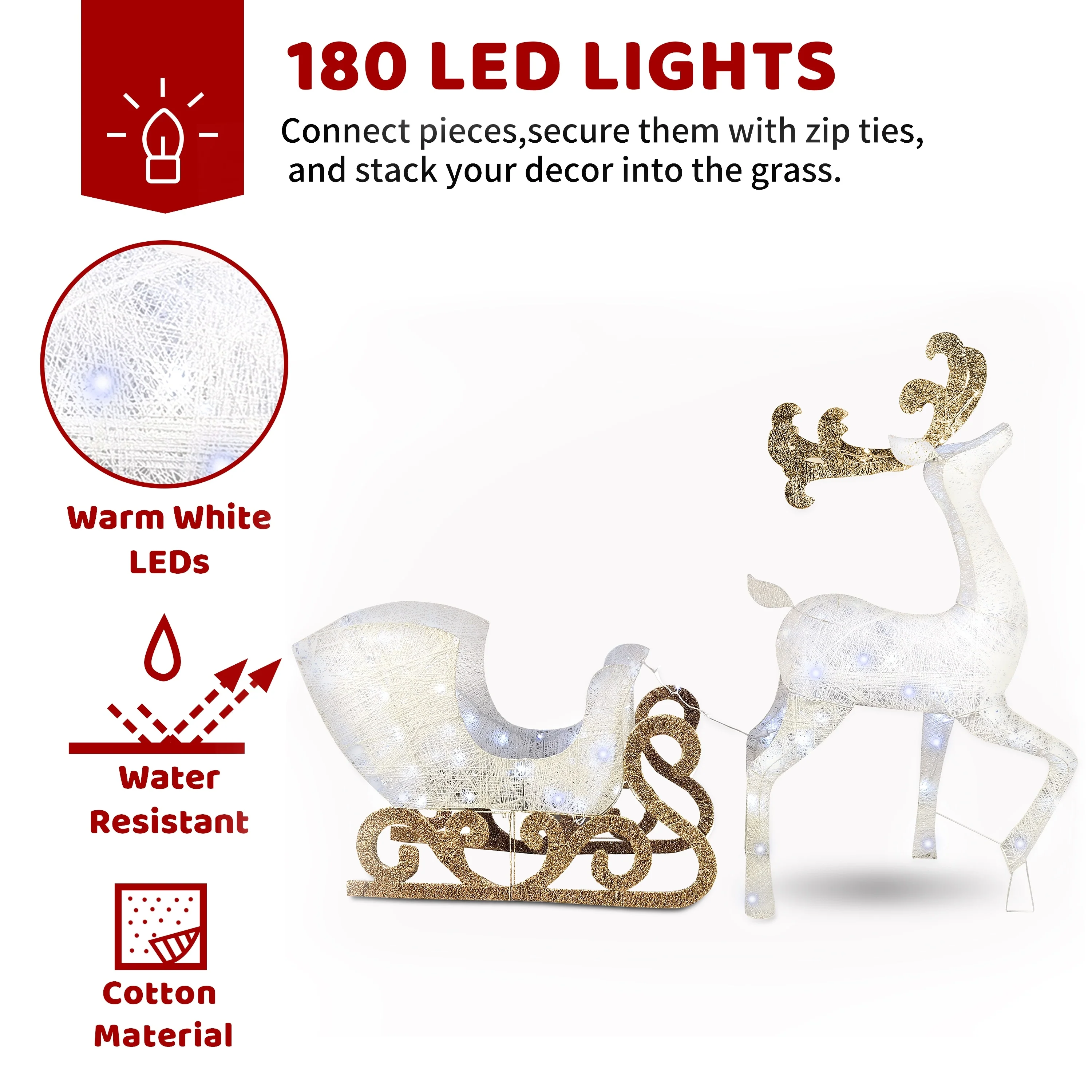 Joyfy Reindeer and Sleigh Christmas Decoration, 180 LED Lighted Outdoor Xmas Decor - White, Gold