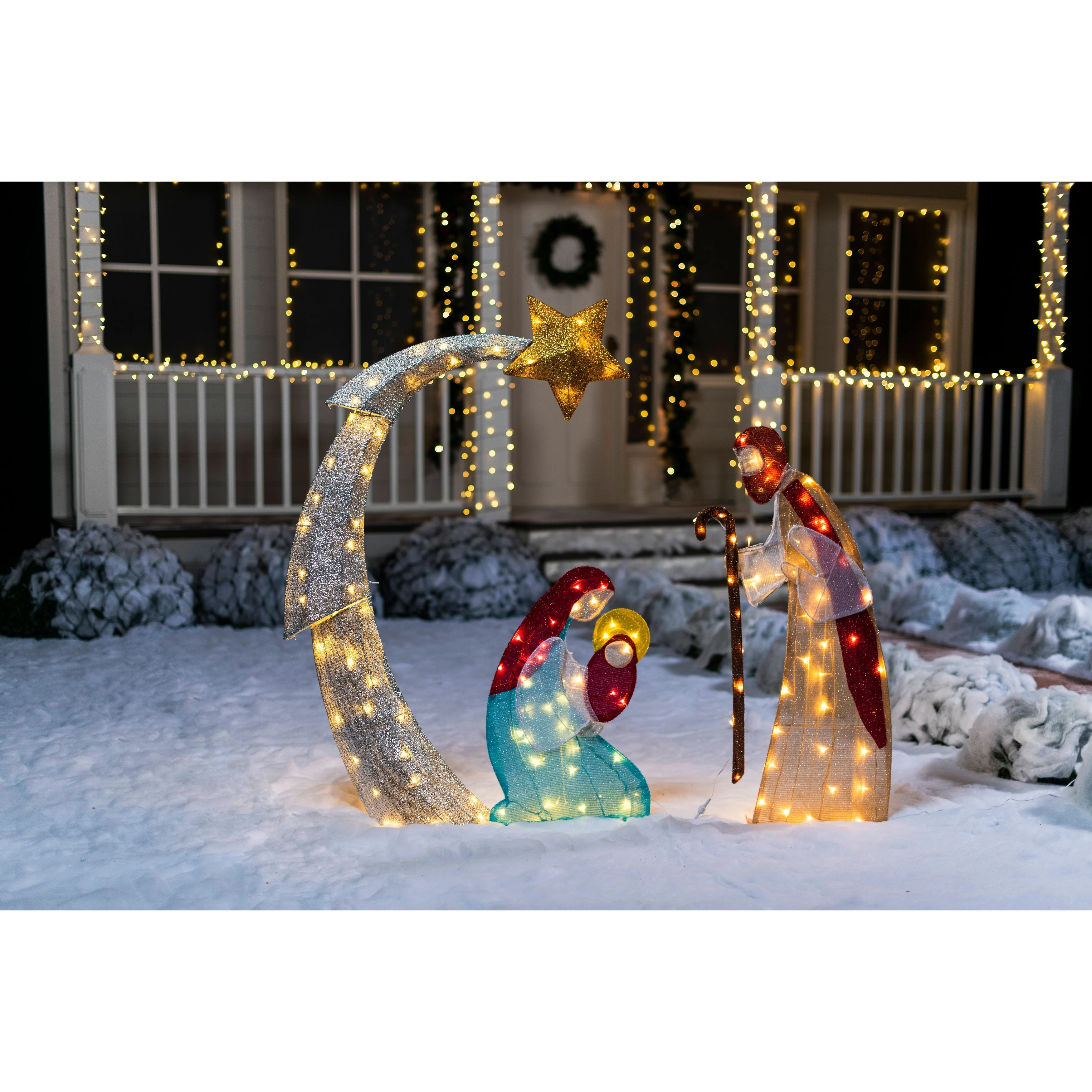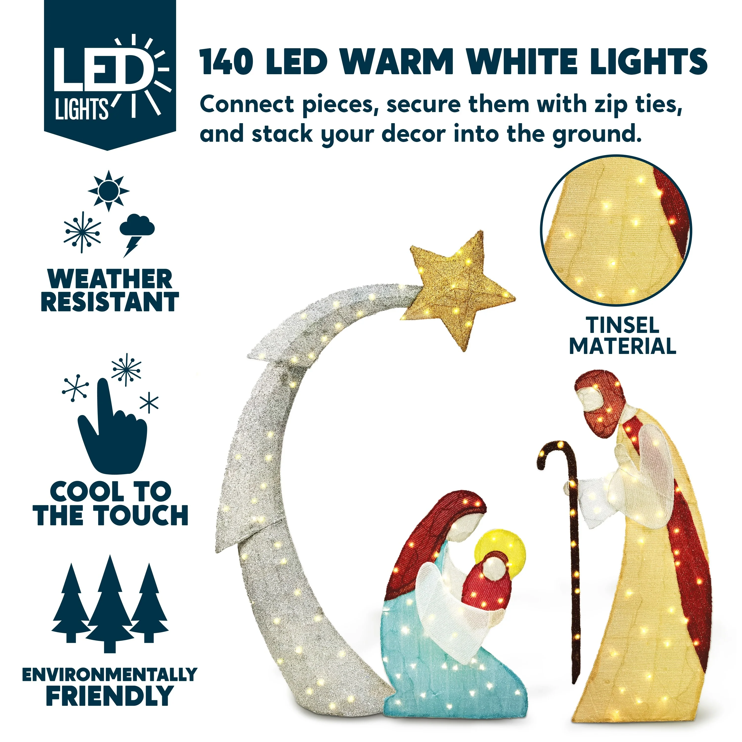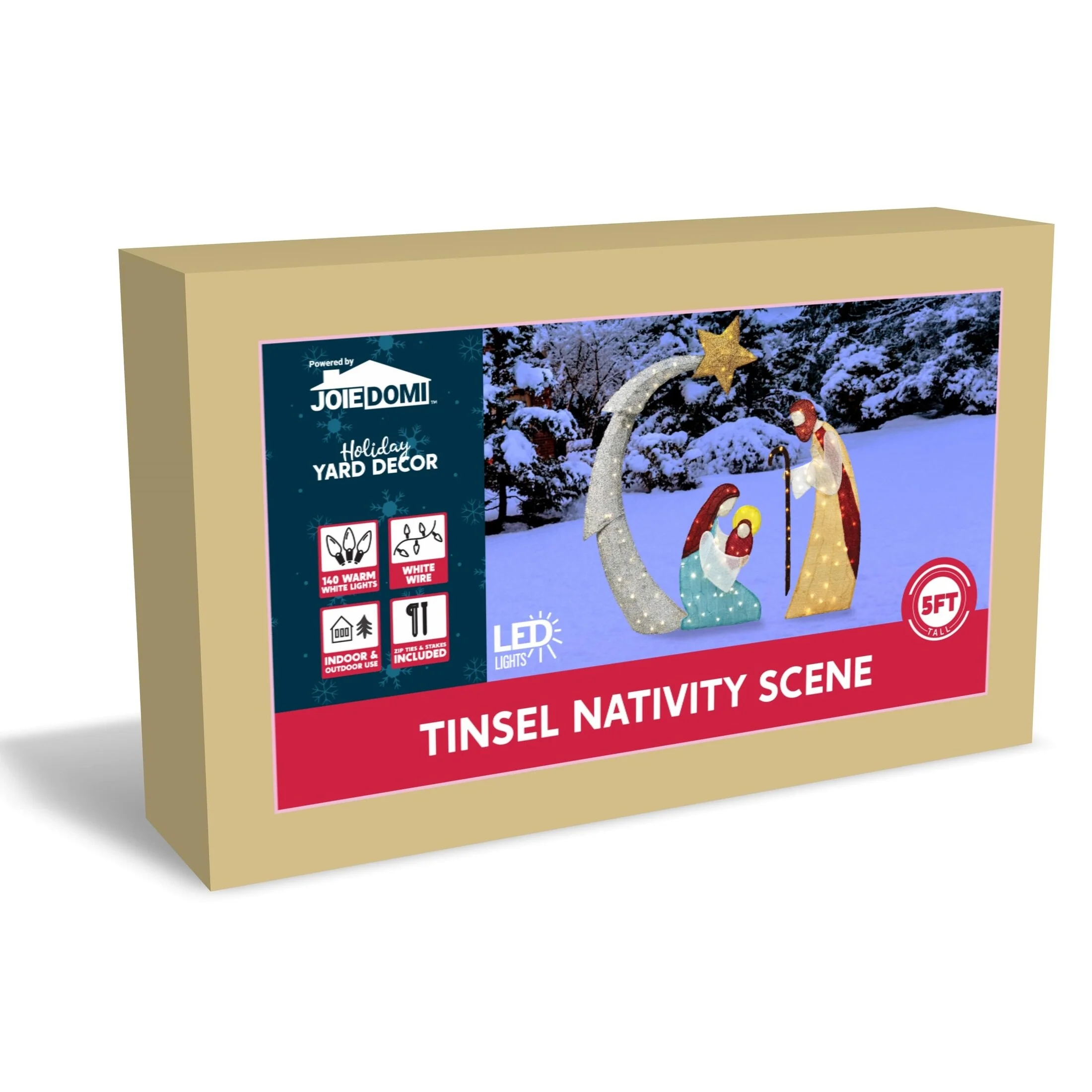 Joyfy 5FT 3D Christmas Nativity Scene Tinsel Yard Light, 140 Pre-Lit LED Warm White Lights - Multi-Color