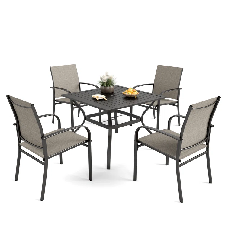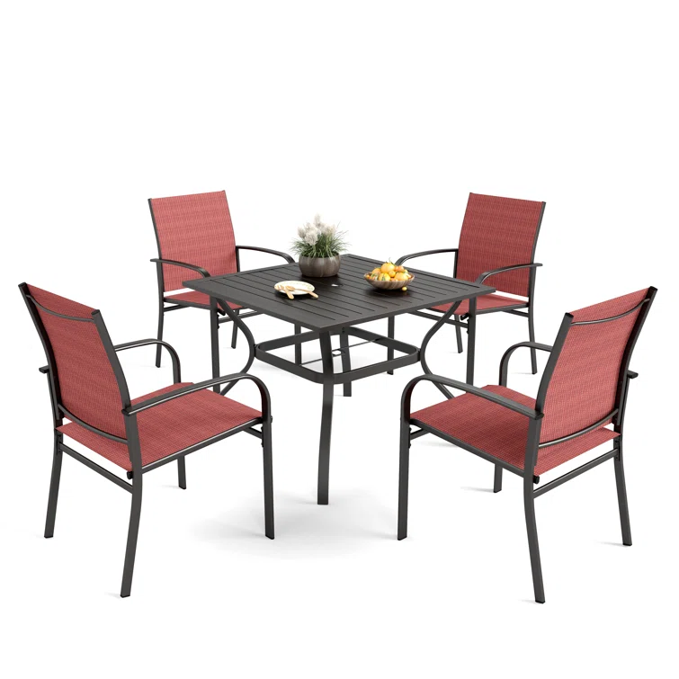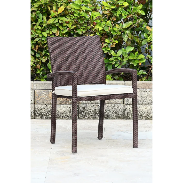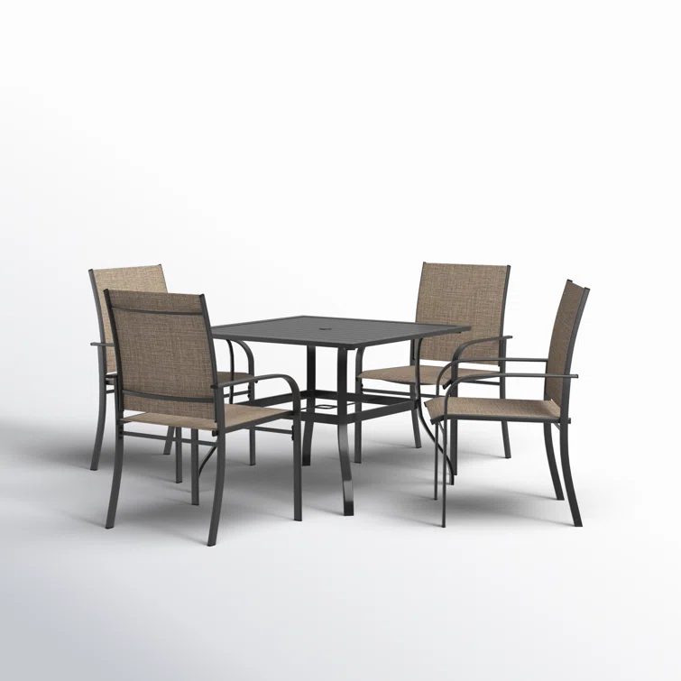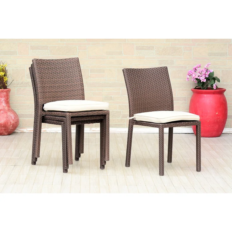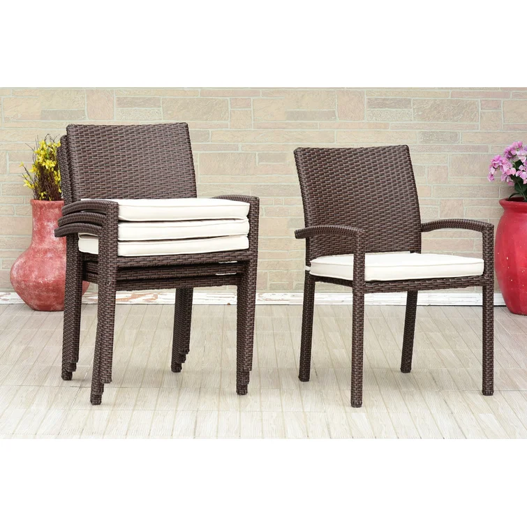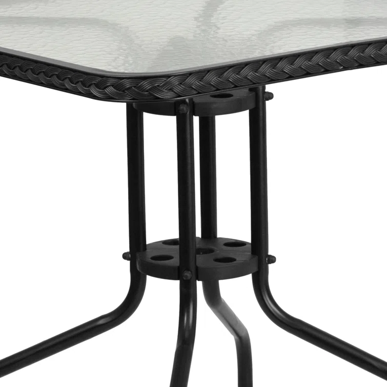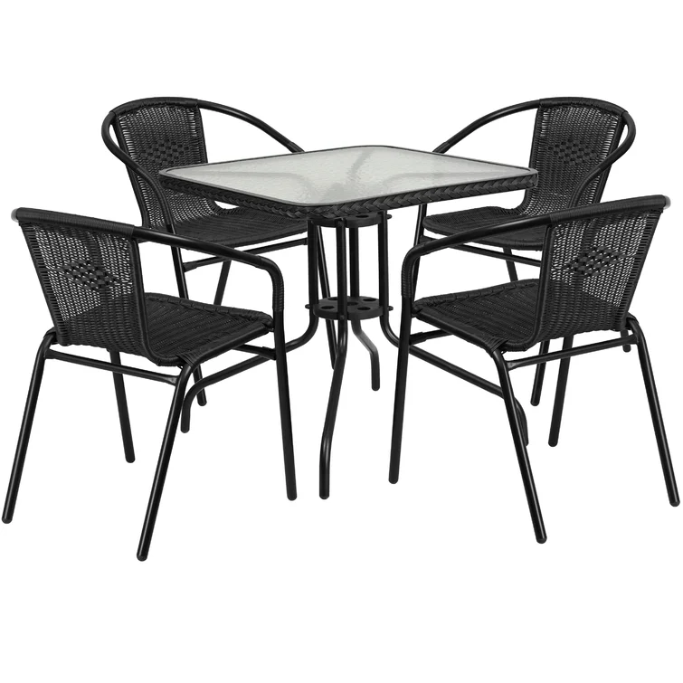 Amlie 28'' Square Glass Metal Table with Rattan Edging and 4 Rattan Stack Chairs