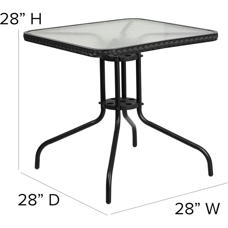 Amlie 28'' Square Glass Metal Table with Rattan Edging and 2 Rattan Stack Chairs